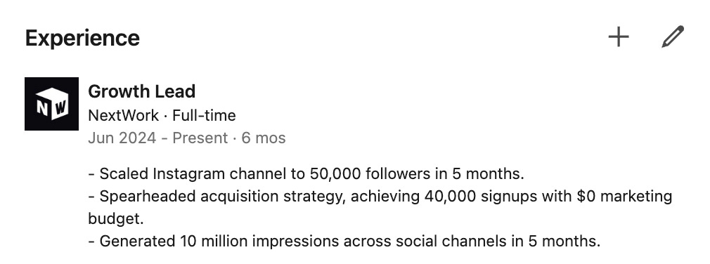 List your past roles with more than just a title and responsibilities. Use this section to call out measurable achievements and tangible impact.